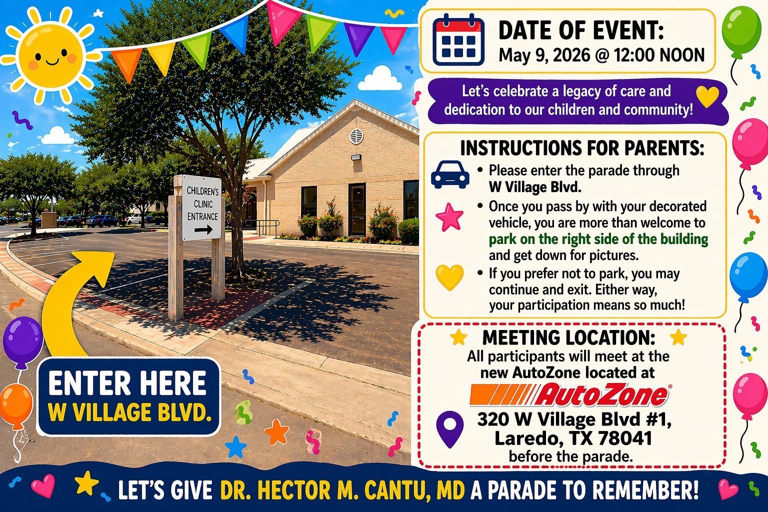 After the parade, families will be welcome to park, visit with Dr. Cantu, take pictures, and share warm wishes. It will be a fun, memorable, and truly touching event for everyone.